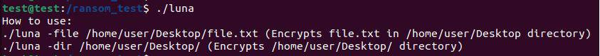 Our Linux sample required an argument to execute. The options were -file [file] to encrypt a single file, or -dir [directory] to walk and encrypt the contents of a specified directory and drop a ransom note. If executed with no arguments, Linux LUNA returns a help page with instructions to use one of the two available arguments. If executed with both the -file and -dir arguments (including multiple files or directories), all arguments are used.