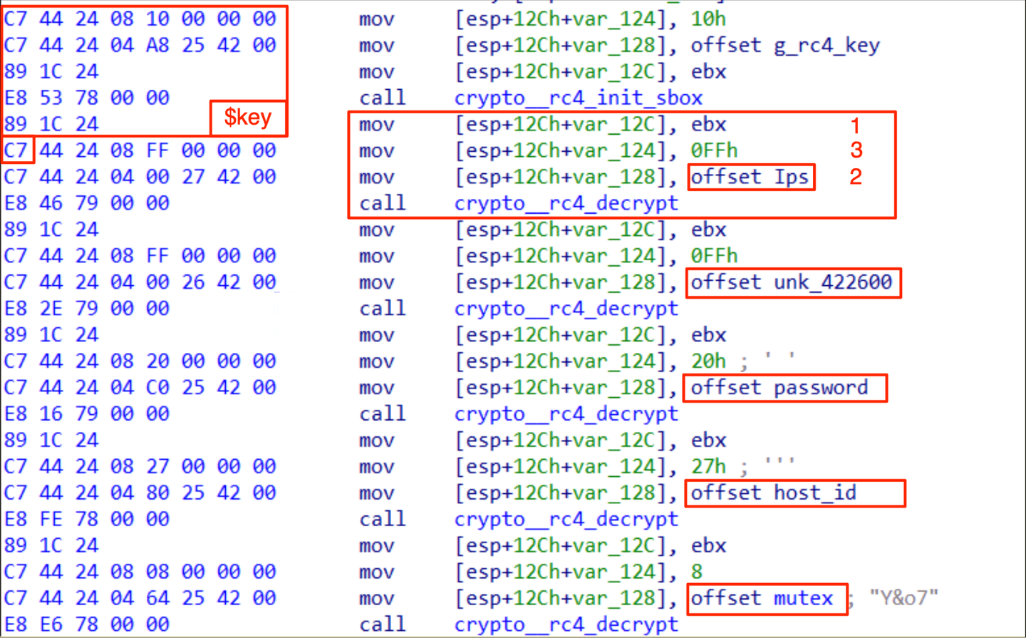 While reversing our samples the analysts noticed that for both the crypto::rc4_init_sbox and crypto::rc4_decrypt functions the second argument (#2 in the image below) is always a memory address for the desired encrypted configuration value, and the third argument (#3) is an immediate value written to the memory stack before the call which represents the size of the encrypted string.