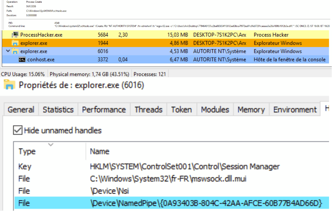 The first stage has a special execution path where it registers a service handler if the process is running under the SYSTEM account. The QBOT service then executes stages 2 and 3 as normal, corrupting the binary yet again and executing commands on behalf of other QBOT processes via messages received through a randomly generated named pipe: