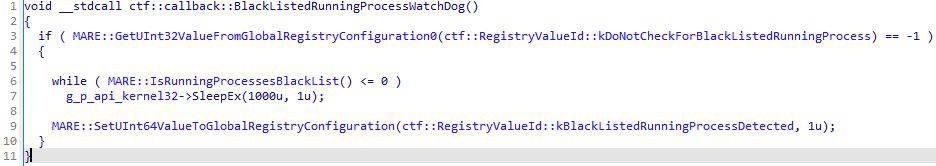 The malware will proceed to creating a watchdog thread to monitor running processes against a hardcoded list of binaries every second. If any process matches, a registry value is set that will then change QBOT behavior to use randomly generated IP addresses instead of the real one, thus never reaching its command and control: