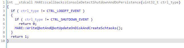 QBOT begins its third stage by registering a window and console event handler to monitor suspend/resume and shutdown/reboot events. Monitoring these events enables the malware to install persistence dynamically by dropping a copy of the QBOT binary in the persistence folder and creating a value under the CurrentVersion\Run registry key: