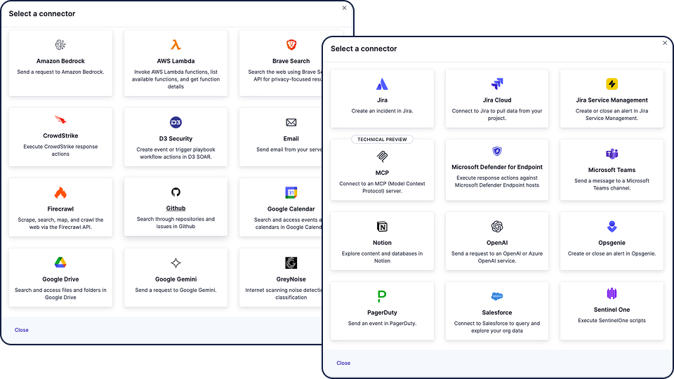 Playbooks handle enrichment, escalation, and response. AI agents reason when investigations go off-script. Both run where your security data lives.