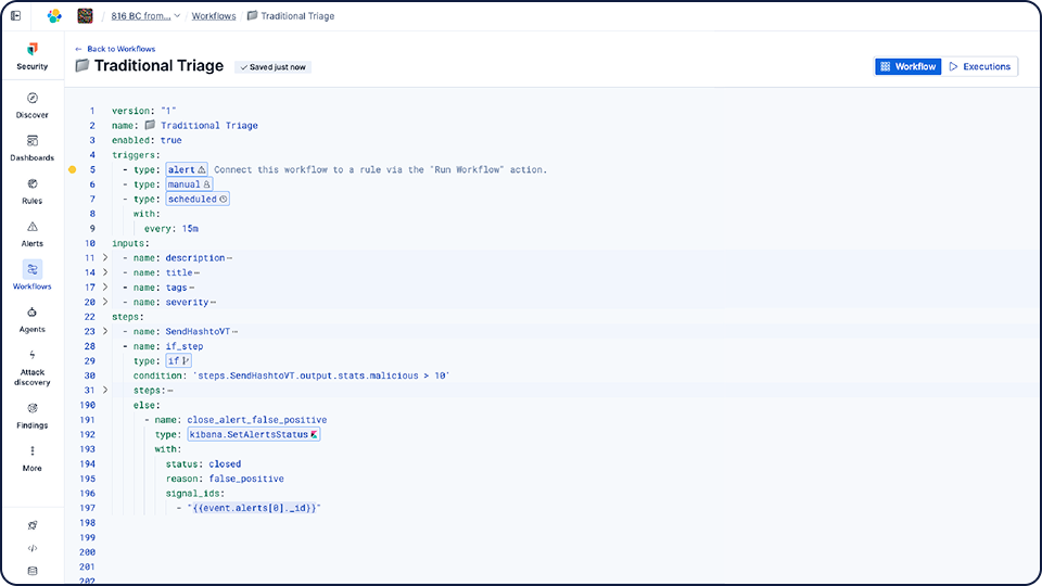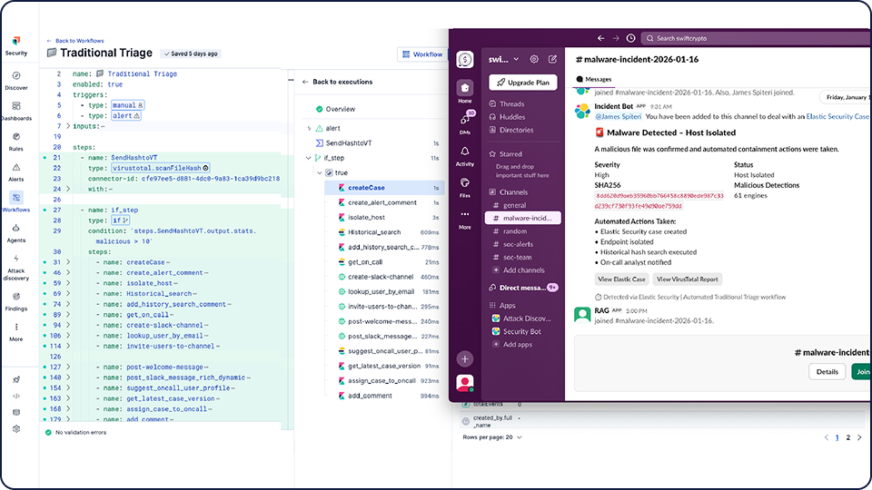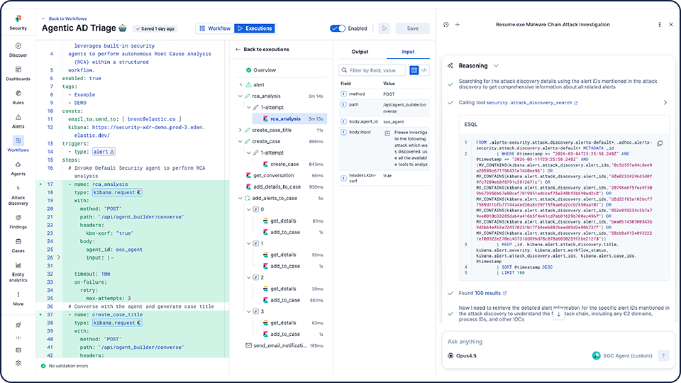 Elastic Workflows brings automation directly into Elastic Security, an agentic security operations platform. You can use playbooks to handle defined tasks with consistency and reliability, while AI agents step in to reason through investigations that fall outside your standard scripts. No separate SOAR tool to buy, integrate, or maintain.